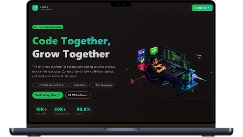 💻 Codiq is a modern, full-stack real-time platform that enables users to solve coding problems, execute code instantly using the Piston API, and collaborate in 1-on-1 live sessions with integrated video calling and chat. It features secure Clerk authentication, dynamic session management (2/2 max participants), screen sharing, threaded messaging, and a sleek, responsive interface with resizable panels.